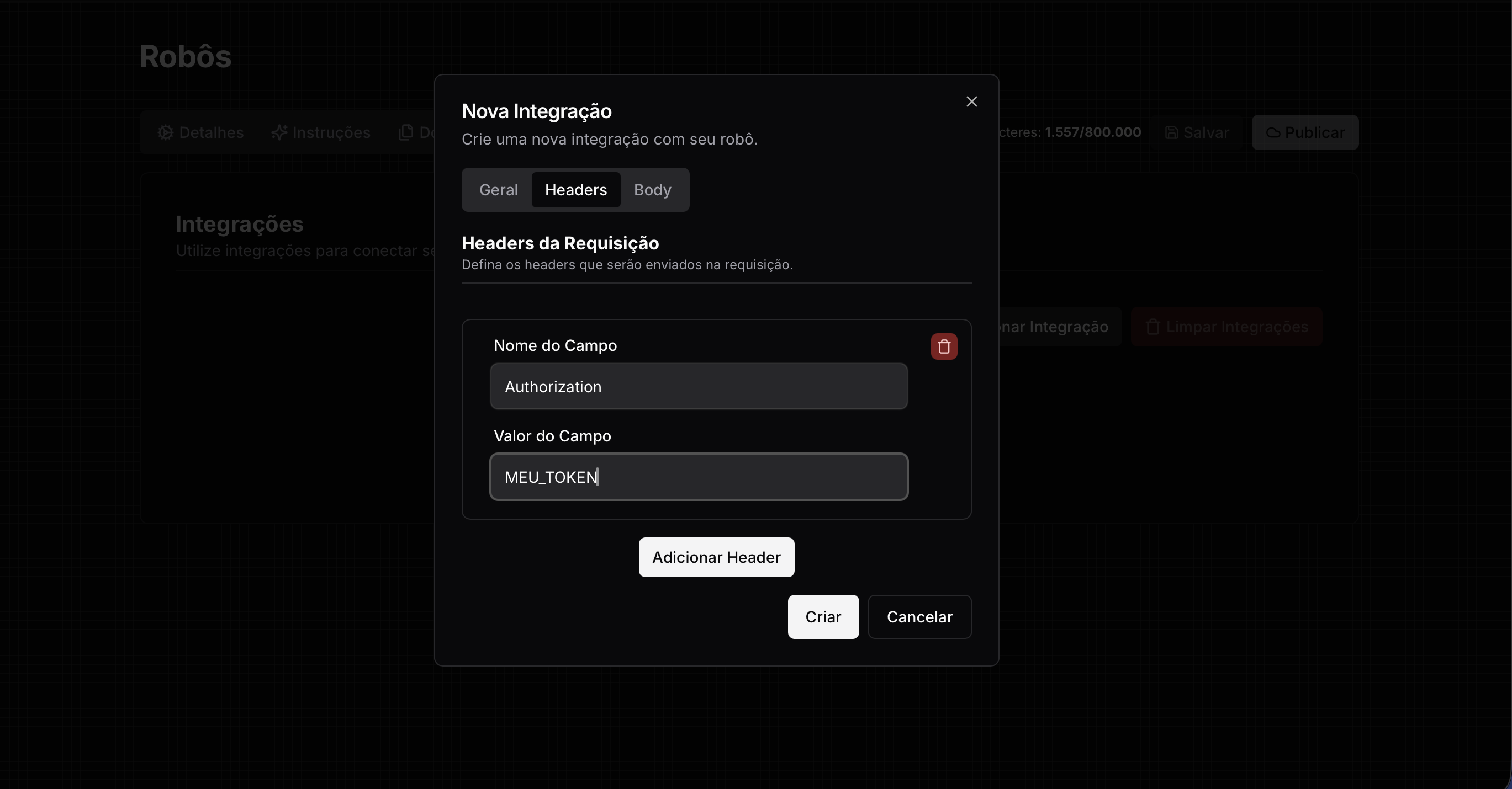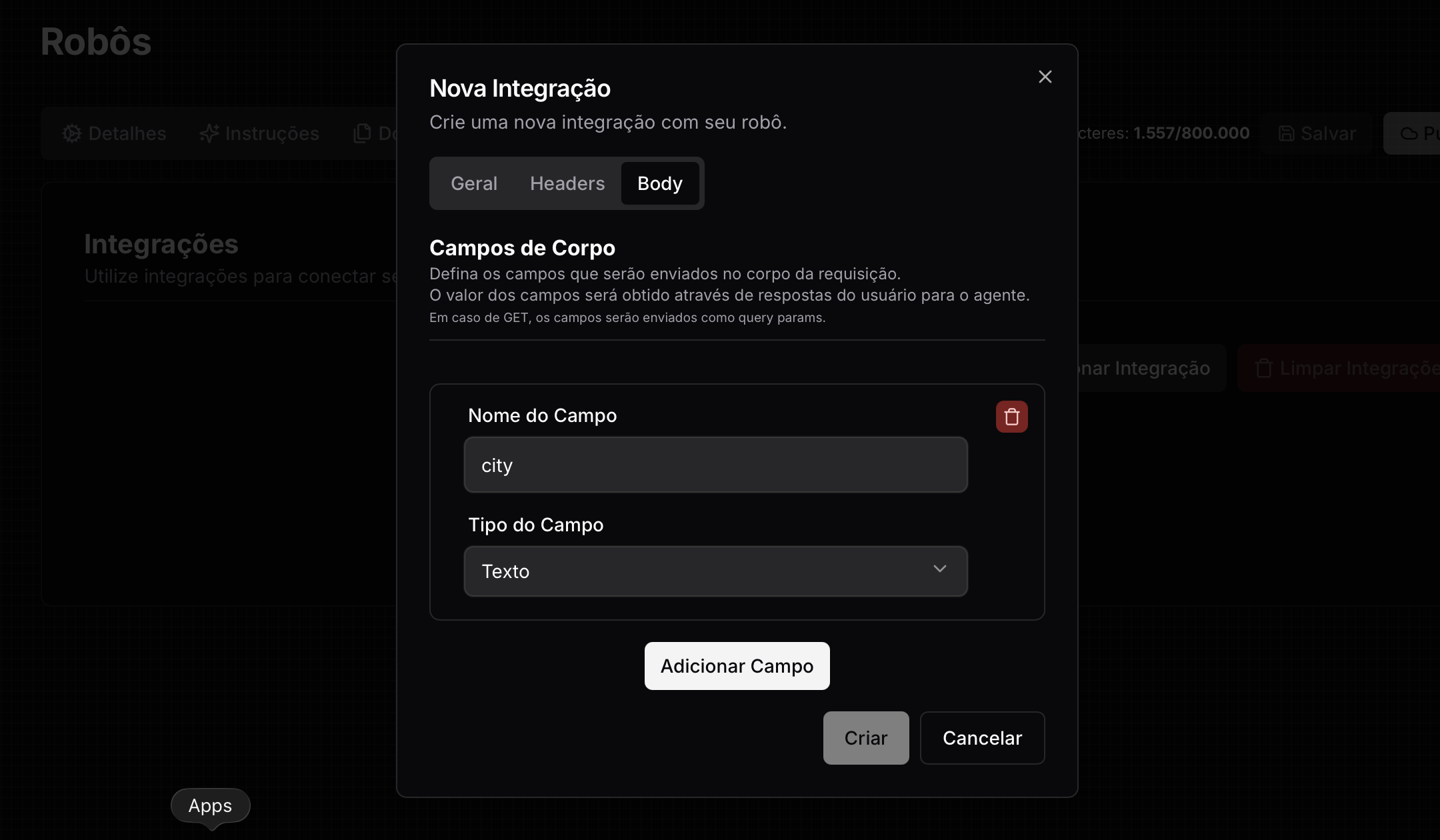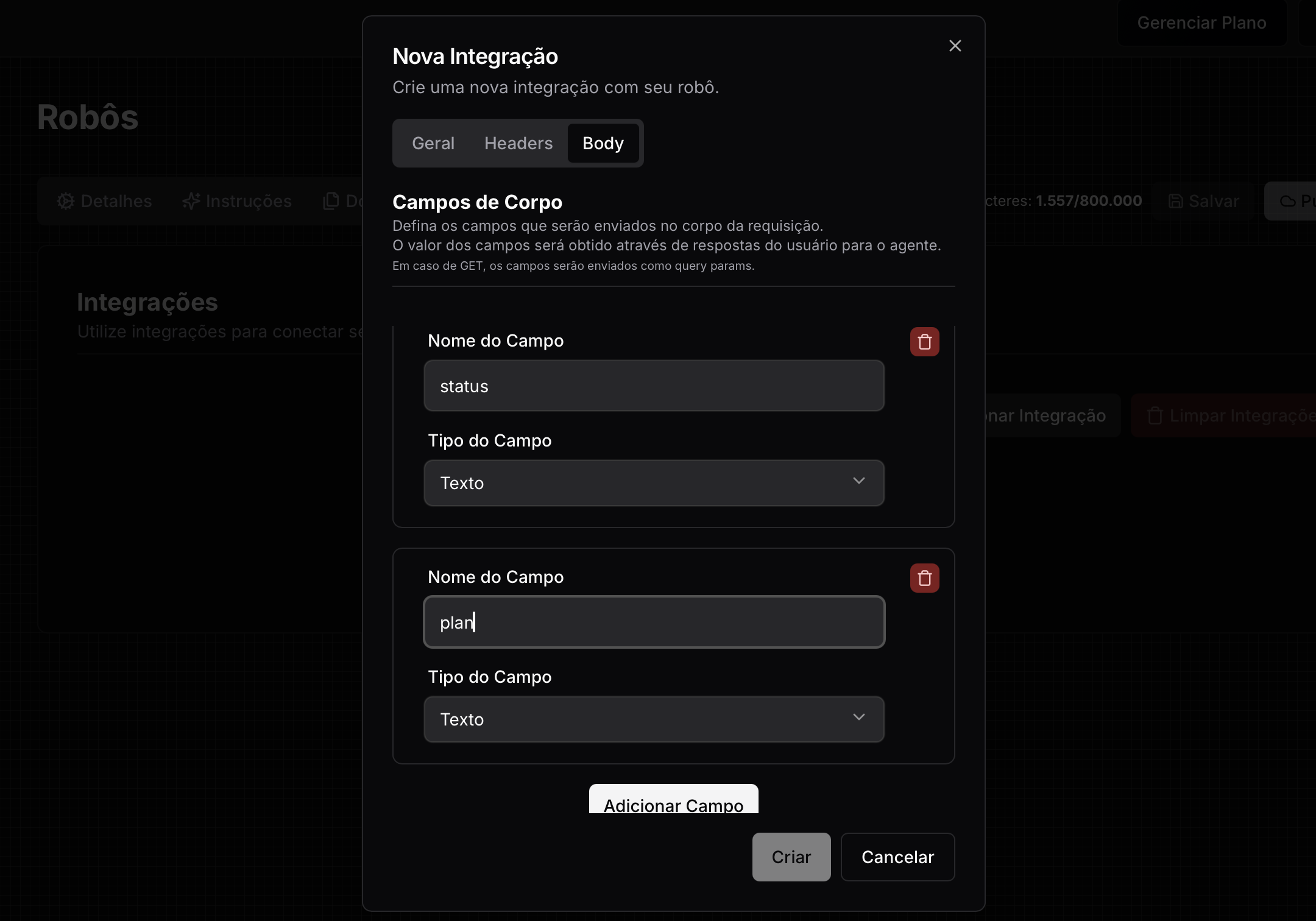 - É aqui que você define quais parâmetros serão enviados no Body / Corpo da requisição (ou nos Query Params no caso de requisições GET). Você deve apenas informar o nome do campo a ser enviado e o tipo do campo. O robô se encarrega de obter os dados no contexto da conversa caso possua ou perguntará ao usuário sobre o dado necessário caso não possua acesso a informação ainda. Cada campo a ser enviado é composto por dois parâmetros de configuração: