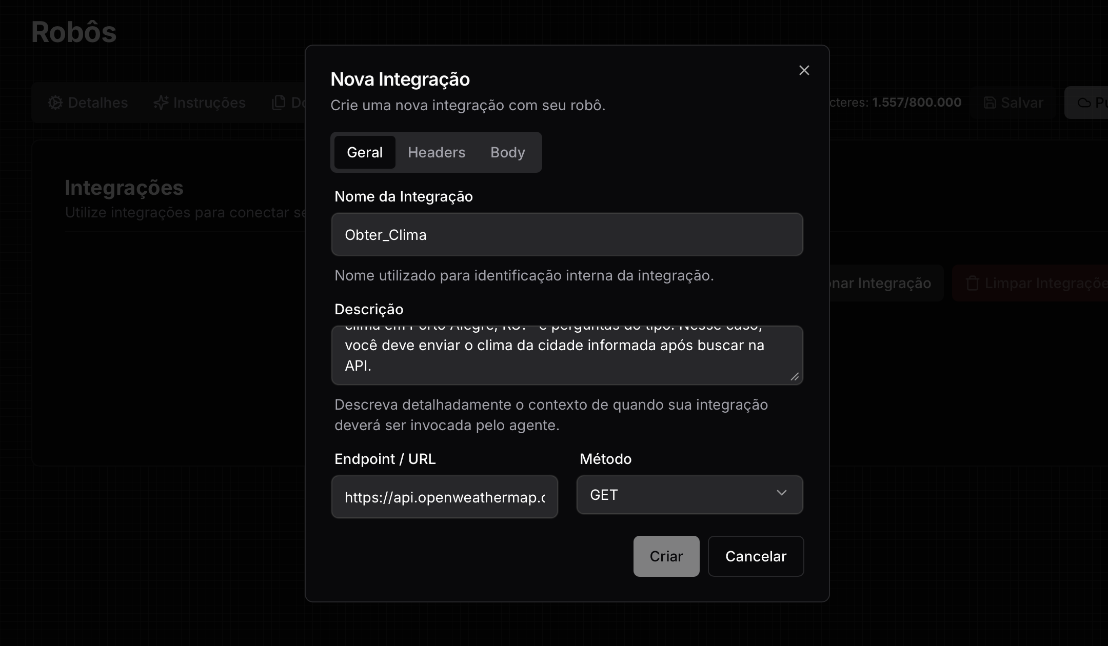 Neste exemplo, usamos uma API “Obter Clima” para fornecer as informações meteorológicas das cidades solicitadas pelo usuário ao agente de I.A. Na seção Geral, adicionamos Obter_Clima como nome da ação de API. Fornecemos as informações sobre “Quando Usar” na descrição para que o agente de I.A use essa API sempre que for questionado sobre o clima de qualquer cidade. Selecionamos aqui o método “GET” para buscar dados.
